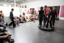 "360 degrees refers to the possibility of seeing from every angle, encompassing the immediate reality with our senses. Social media and even Zoom meetings promise a wide access, even if we are not physically there. A simple rotating platform serves as the stage for a very beautiful dramatization on our multiplication of FOMOs." - Chus Martínez